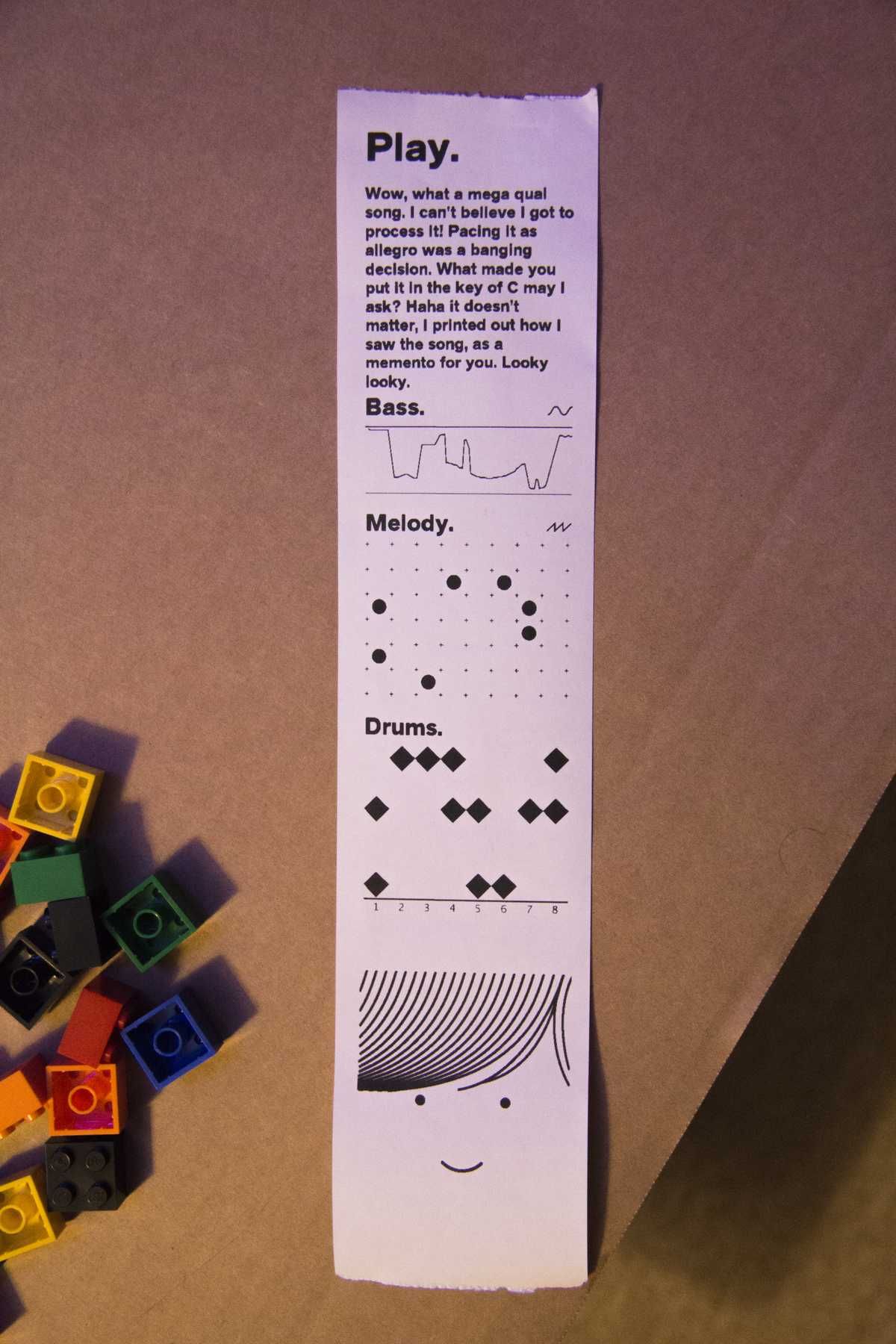 All the instruments were in the same key and could not go outside of it, which allowed any arrangement to sound like it worked. Users could then print their song out, for a unique keepsake.